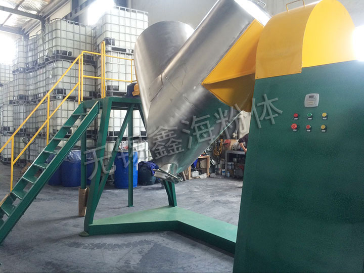 V型混合機一端裝有電機與減速機,電機功率通過皮帶傳給減速機,減速機再通過聯軸器傳給V型桶。使V型桶連續運轉,帶動桶內物料在桶內上、下、左、右進行混合。