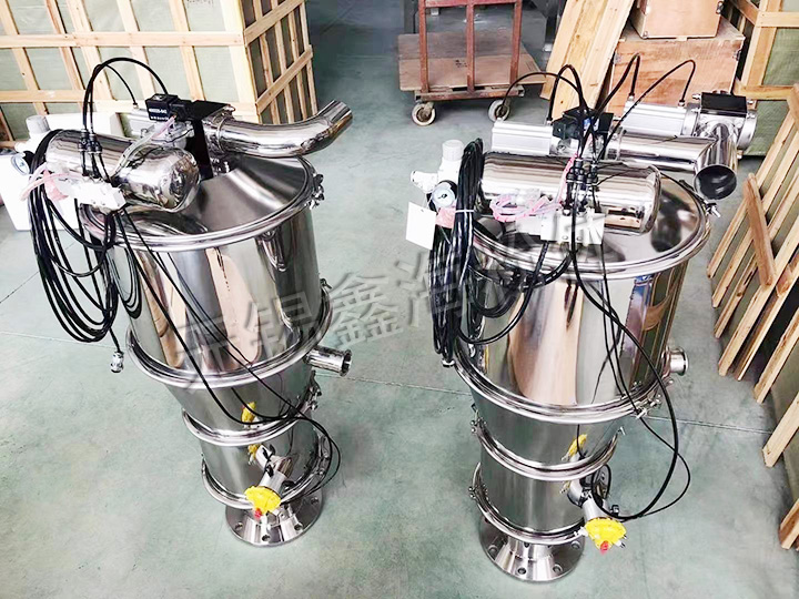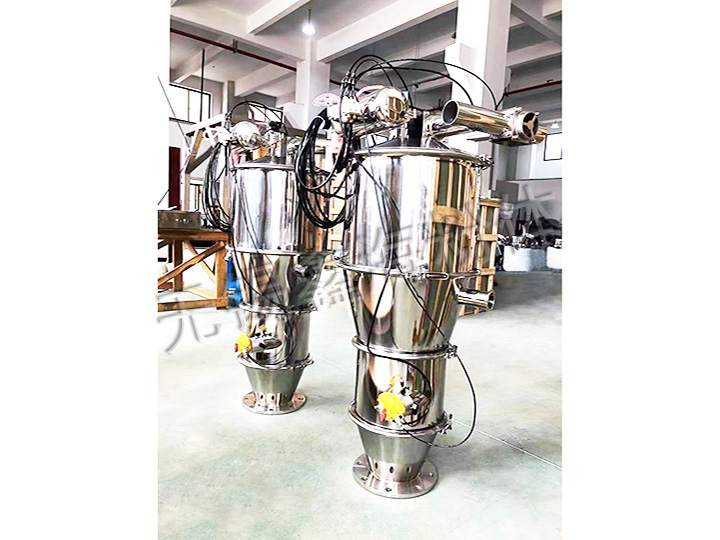 真空上料機(jī)中裝有壓縮空氣反吹裝置,每次放料時(shí),壓縮空氣脈沖反吹過(guò)濾器,把吸附于過(guò)濾器表面的粉末打落下來(lái),以保證吸料能正常運(yùn)行。